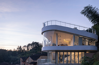 下党零碳示范的主体建筑“宁的茶”零碳茶馆是一座上下两层的纯白建筑。屋顶以莫比乌斯环为设计灵感,将可持续理念贯穿在每一处细节。整个建筑外观上应用大面积超白玻璃和UHPC超高性能混凝土,满足通透的视野、充足的采光的同时,有效降低能源消耗。